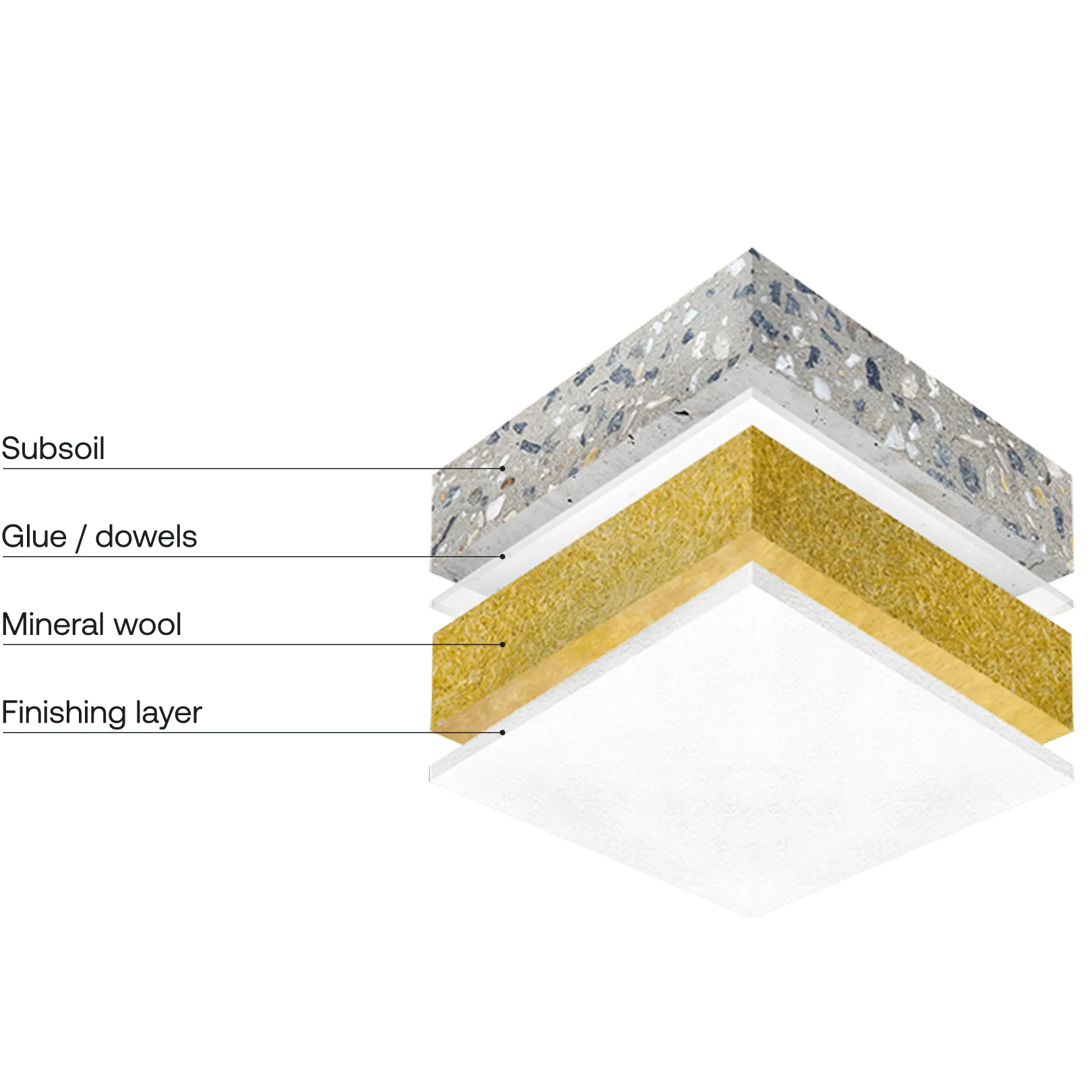Sonacoustic® is a sound absorbing system used on ceilings and ceilings. It is characterized by an even surface with a smooth texture. It consists of two main layers: system mineral wool and hand-rubbed acoustic plaster.