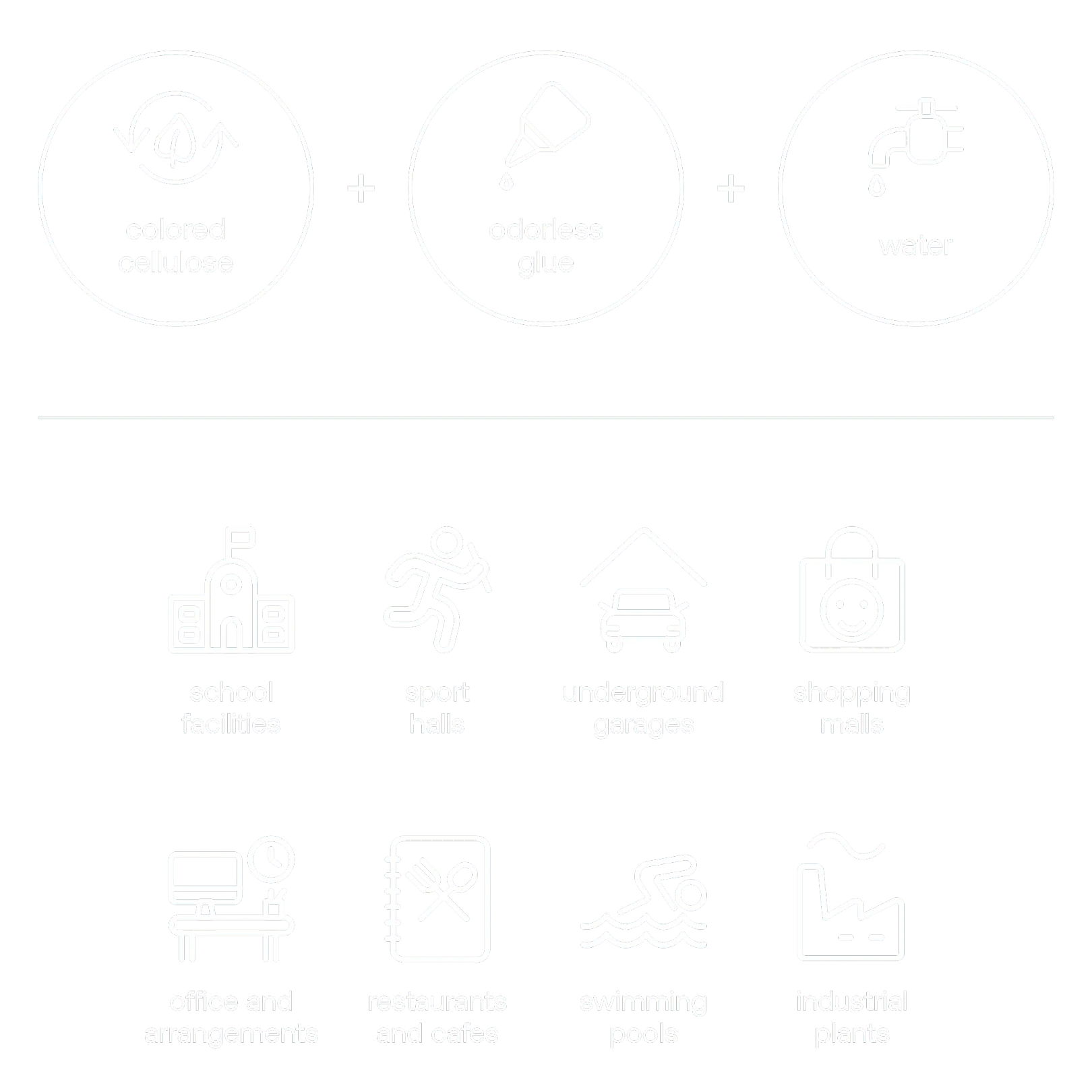 Sonaspray® is a spray of a mixture of dyed cellulose, a special odorless adhesive and water. All the ingredients are combined as they are ejected from the machine. Sonaspray® can be used in any space not exposed to weather conditions.