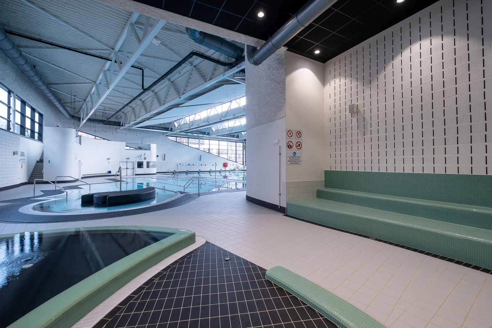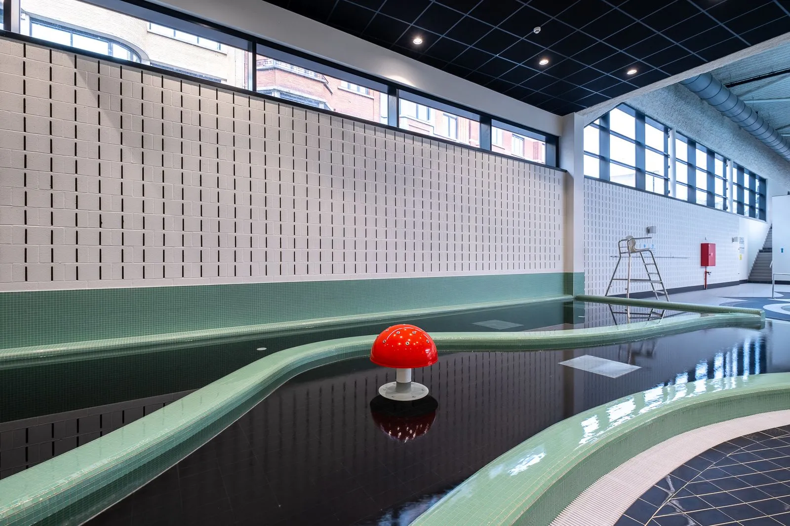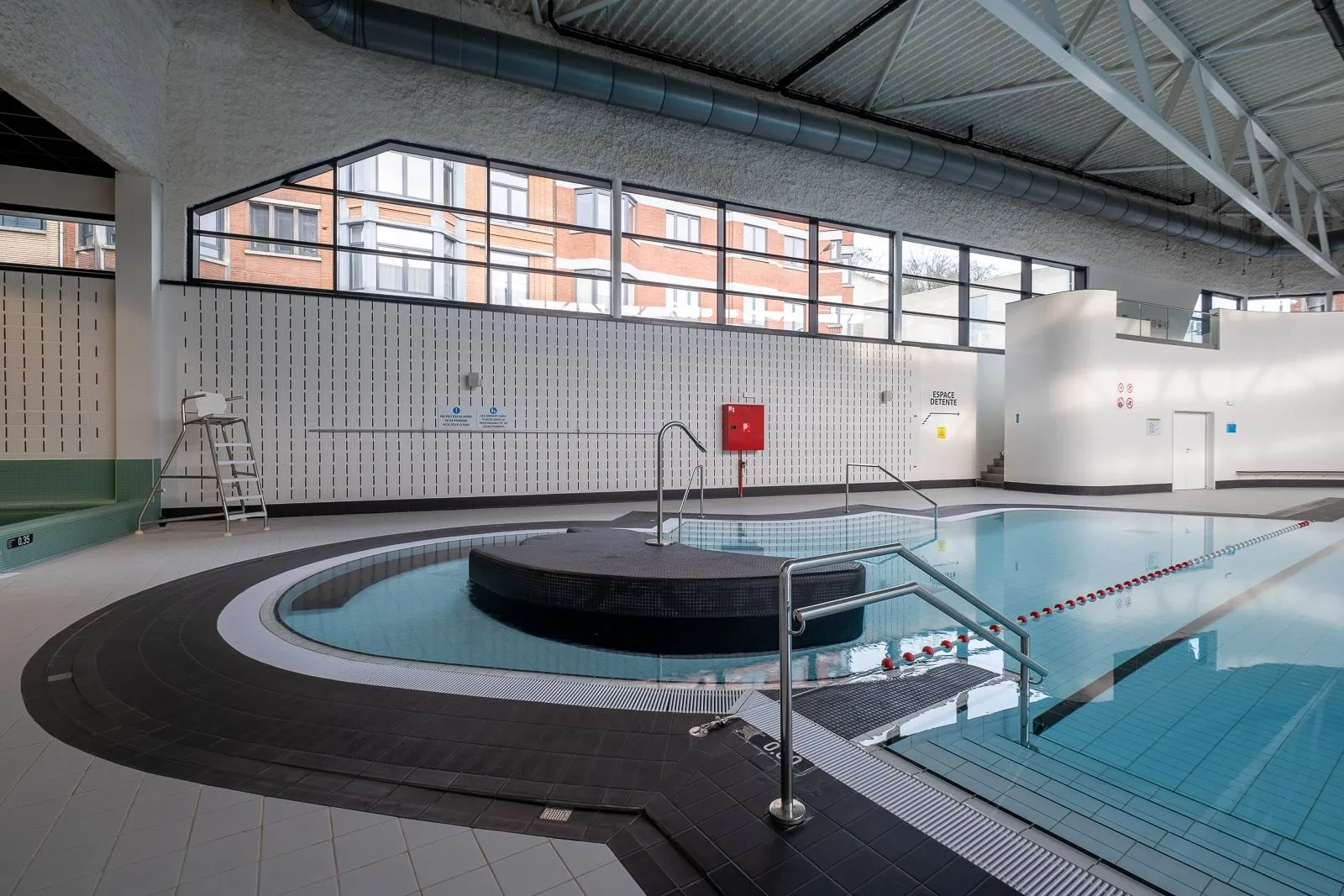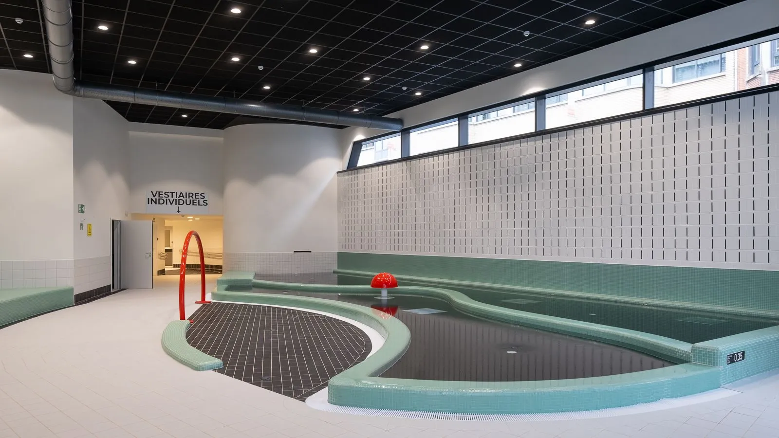 A municipal swimming pool in Liege, Belgium, has been given a good new acoustic treatment. The strengths of two complementary products - Sonaspray® plaster and Soundblox® blocks - were combined in its space. Each is resistant to moisture and impact, although in areas within reach of users (e.g., walls up to a height of more than 2 meters) Soundblox® blocks will be less vulnerable to damage over years of use. The sheet metal ceilings and the upper parts of the walls are additionally covered with Sonaspray® plaster. All together work as an effective acoustic system to reduce the reverberation of a very large volume.