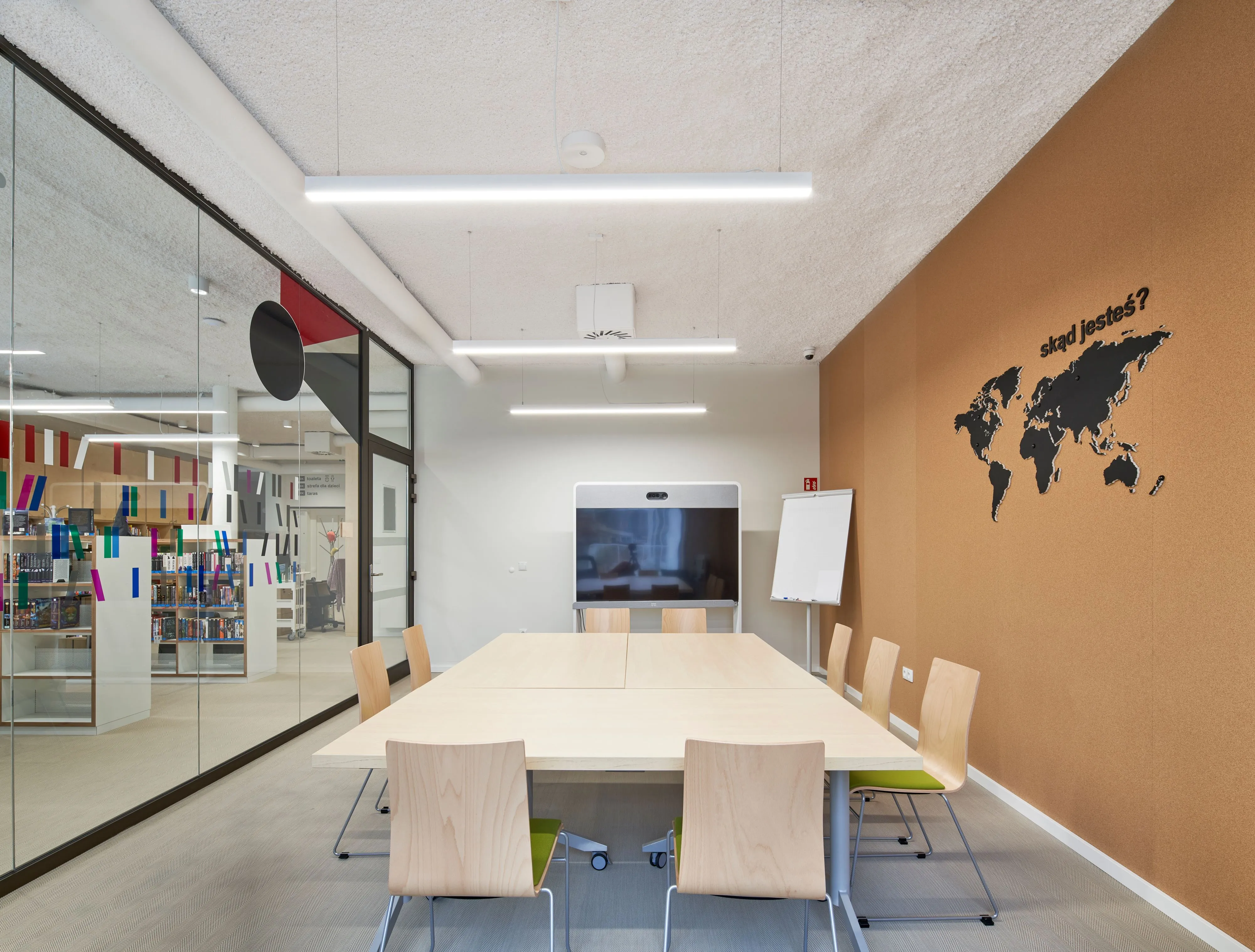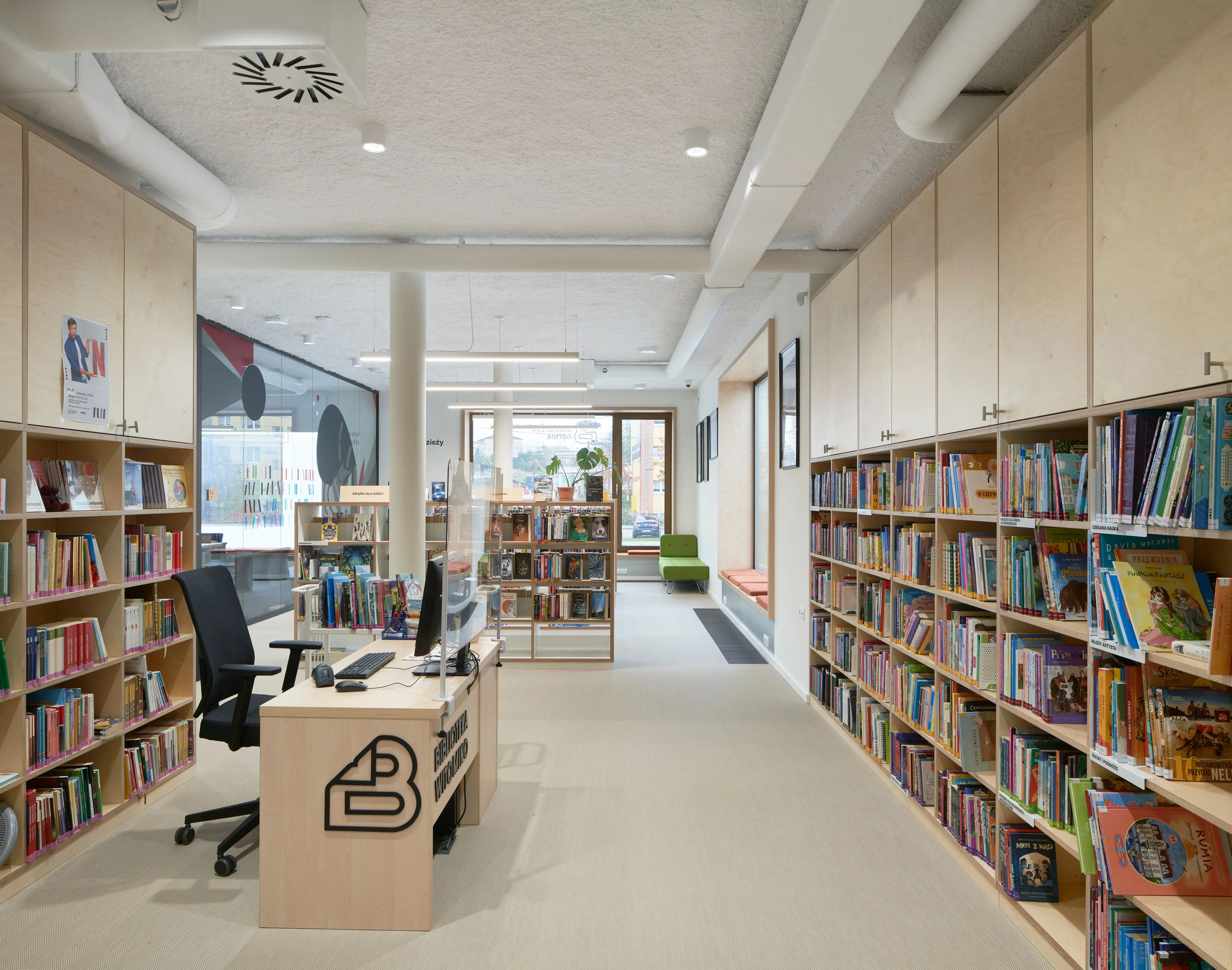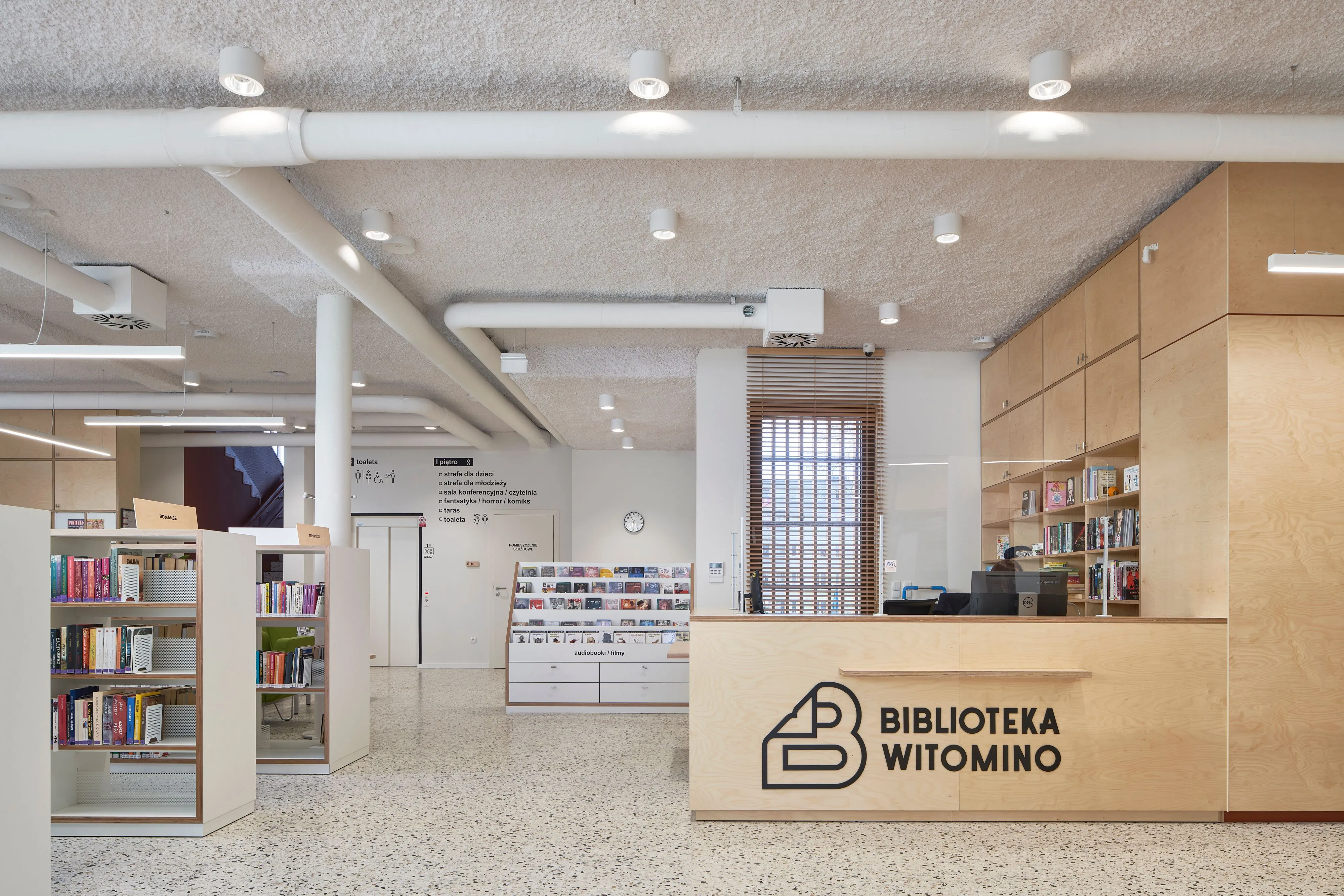 In a library in Witomin, Gdynia, we sprayed Sonaspray® K-13 white acoustic plaster on the ceiling and the installations carried underneath. In this way, the reverberation time was effectively reduced and the space became much more acoustically comfortable, both for employees and occasional users of the building.