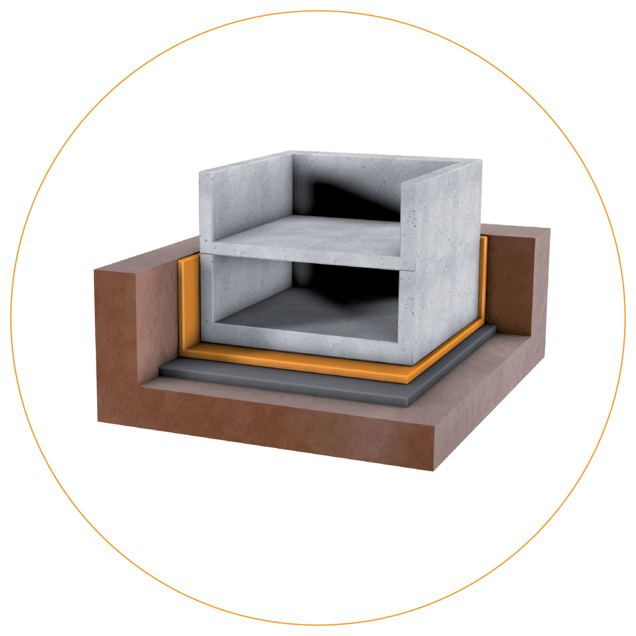 Izolacja budynku od gruntu może być wykonana na trzy główne sposoby: poprzez pełną „wannę” wibroizolacyjną, jako odcięcie ławy fundamentowej lub jako odcięcie kondygnacji naziemnych. Do każdego z tych przypadków stosujemy Sylomer® lub Sylodyn®, poprzedzając to odpowiednim doborem i rozmieszczeniem ich rodzajów.