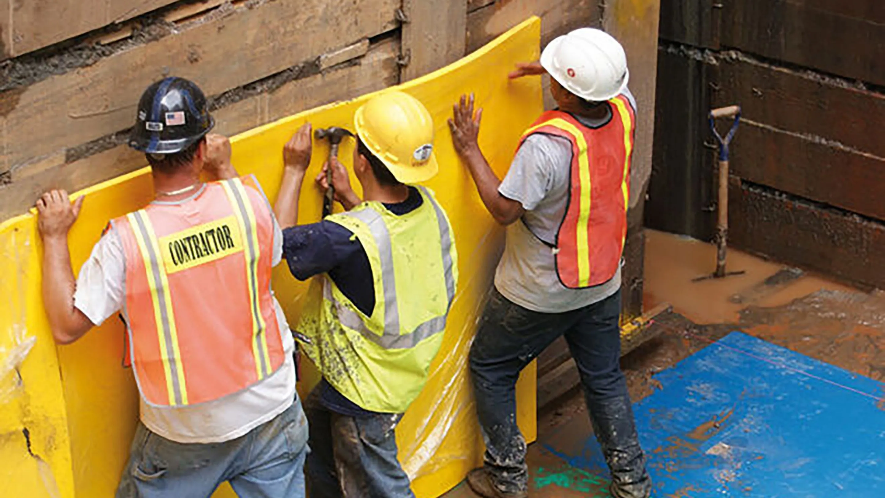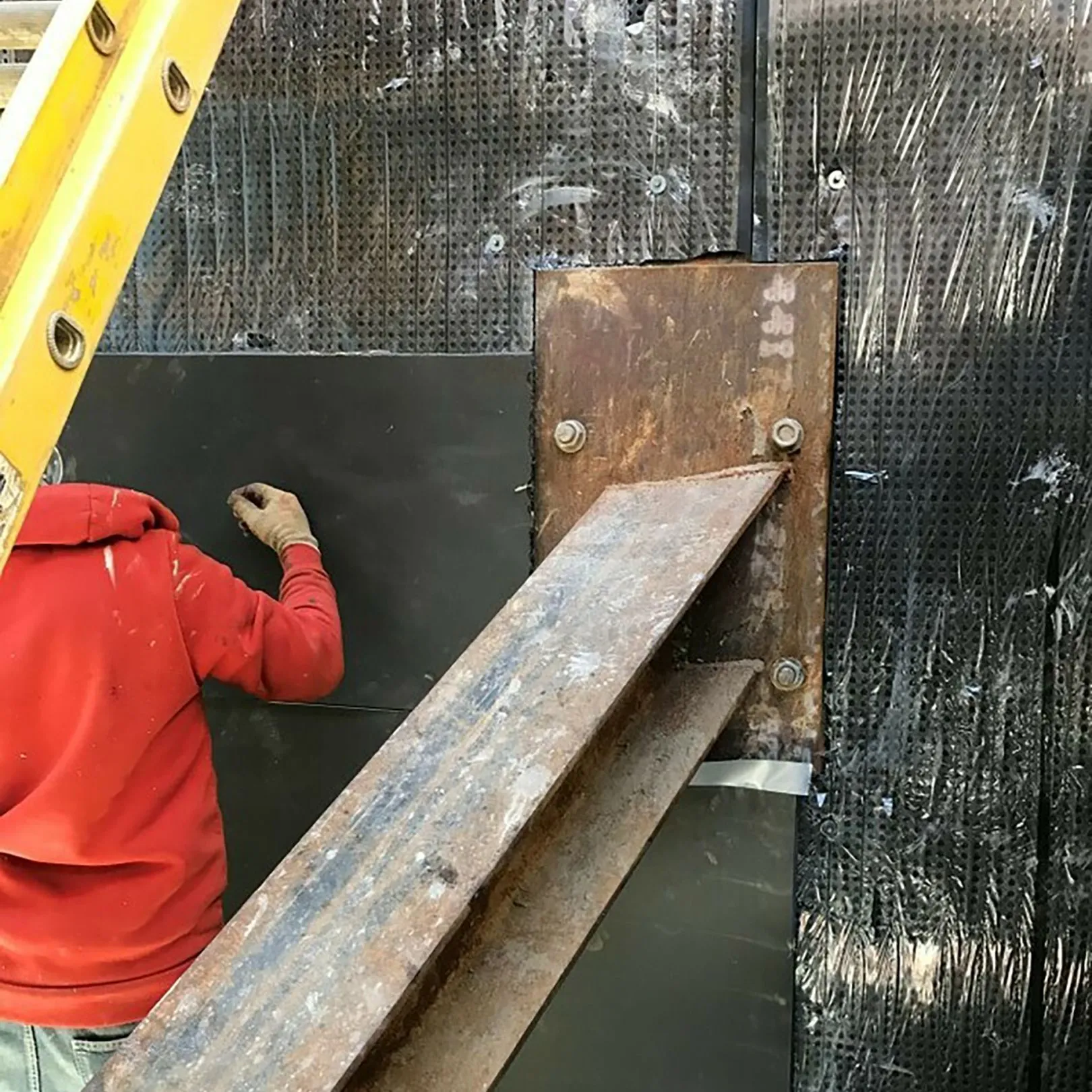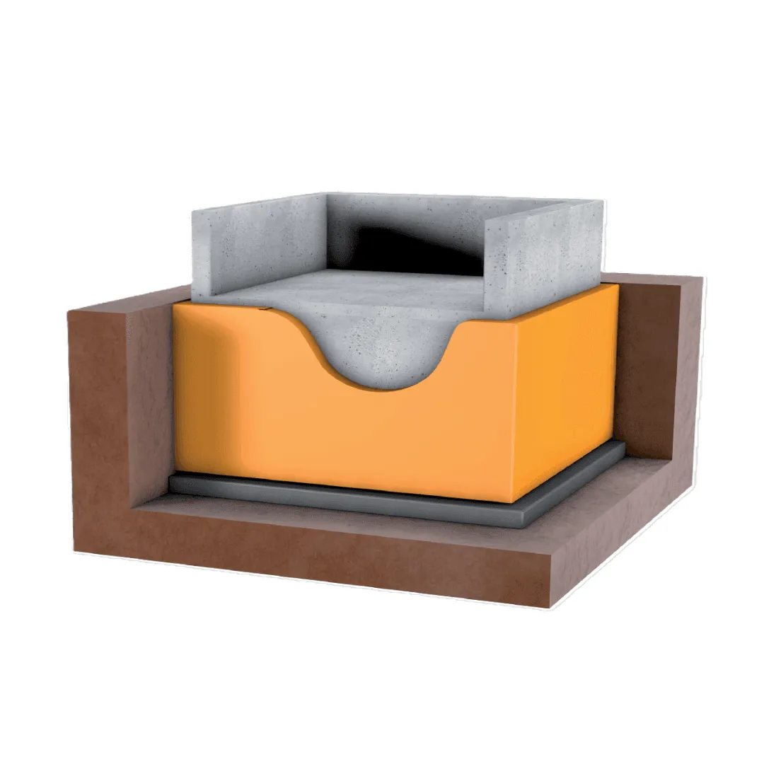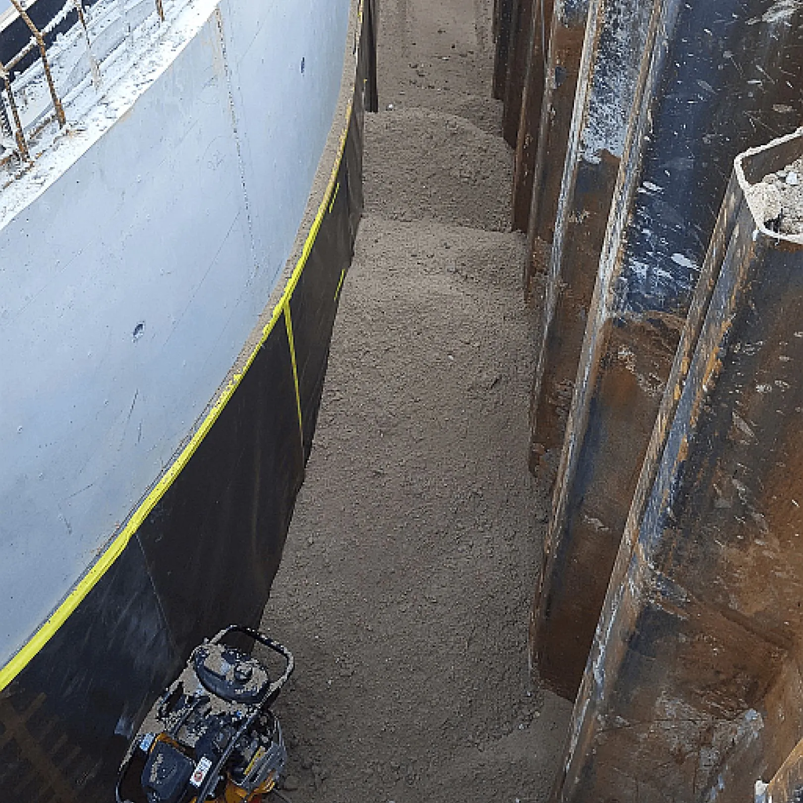 Montaż polega na umiejscowieniu produktu na bokach ścian fundamentowych, od strony gruntu. Jest to skuteczna metoda ograniczenia wpływu drgań na budynek, choć nie zapobiegnie niestety przenoszeniu drgań na fundament przez grunt od spodu.